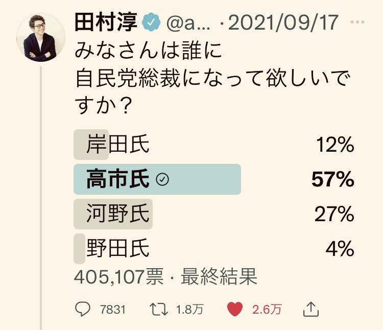 さらに、お笑いの田村淳(石破・河野支持の左翼)がtwitterで実施したアンケート調査(9/17)でも40万票のうち57%が高市議員だった。河野22%、岸田12%と続く。田村淳の期待を裏切り、テレビ人の彼も驚く結果だった。